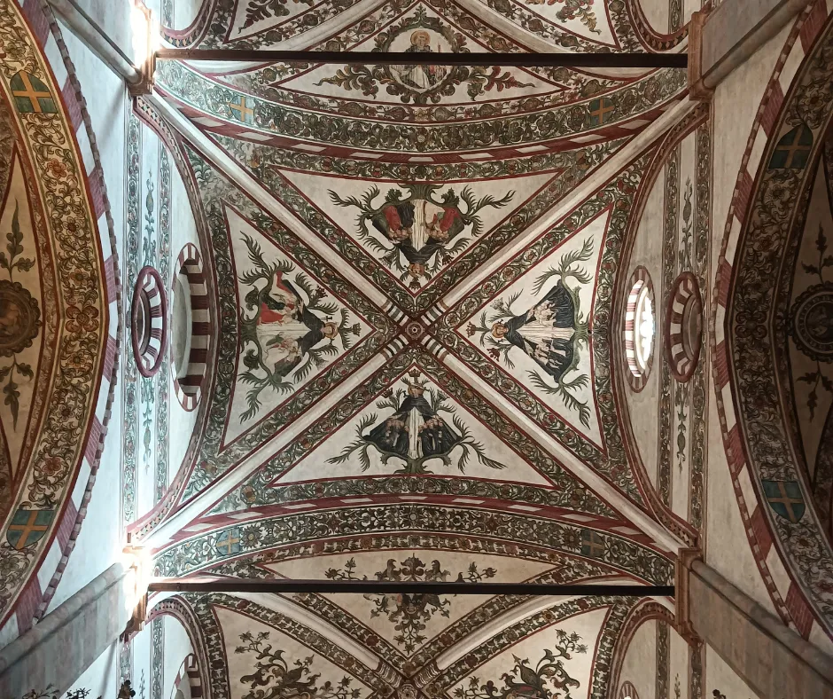 Il soffitto è in legno e realizzato nel 1314 dai benedettini: 416 immagini di santi sono incastonati nei diversi riquadri.