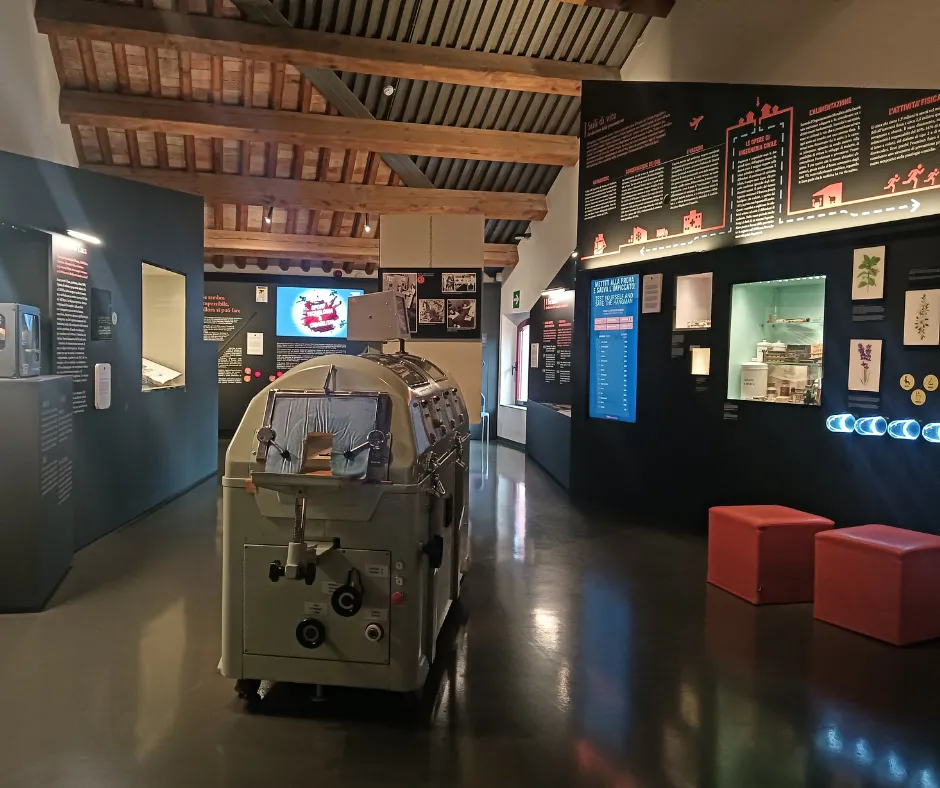 - Sulla parete di fronte, sono riprodotti degli strumenti per permettere al visitatore di simulare l’ascolto dei rumori di alcune patologie. Attraverso un gioco è possibile associare il corretto agente patogeno alla relativa malattia.