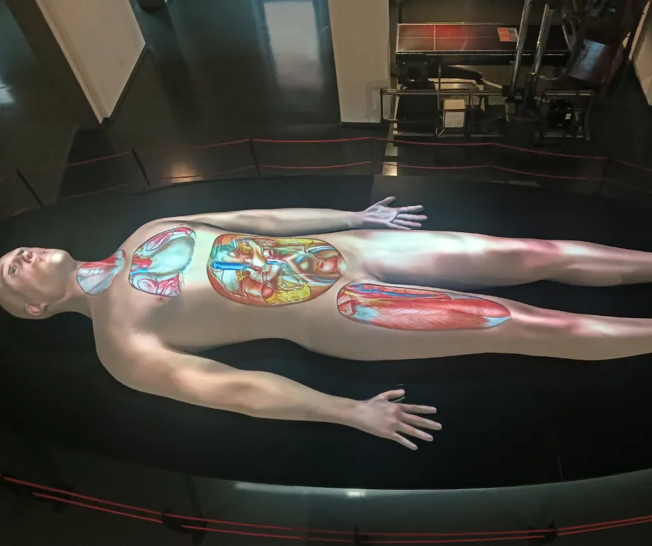 Lo potrai ammirare dall’alto attraverso le otto nicchie, all’interno delle quali potrai approfondire gli organi e gli apparati del corpo umano. Sono esposte immagini tridimensionali e accompagnate da reperti antichi.